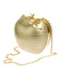 The new collection of apple shaped purses with gold leafs and chains is available in black, purple, orange, red, blue and raspberry color.